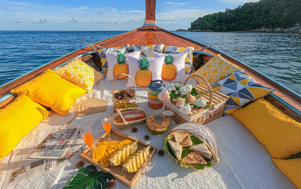 On deck, you’ll be welcomed into an intimate setting curated exclusively for you. A trio of traditional Thai musicians performs live, their melodies — from the soft resonance of the khim to the gentle breath of bamboo flute — creating a serene soundtrack that blends seamlessly with the rhythm of the sea. Sip handcrafted cocktails infused with local botanicals and savor gourmet canapés prepared especially for your cruise, each bite reflecting the island’s refined culinary artistry.
